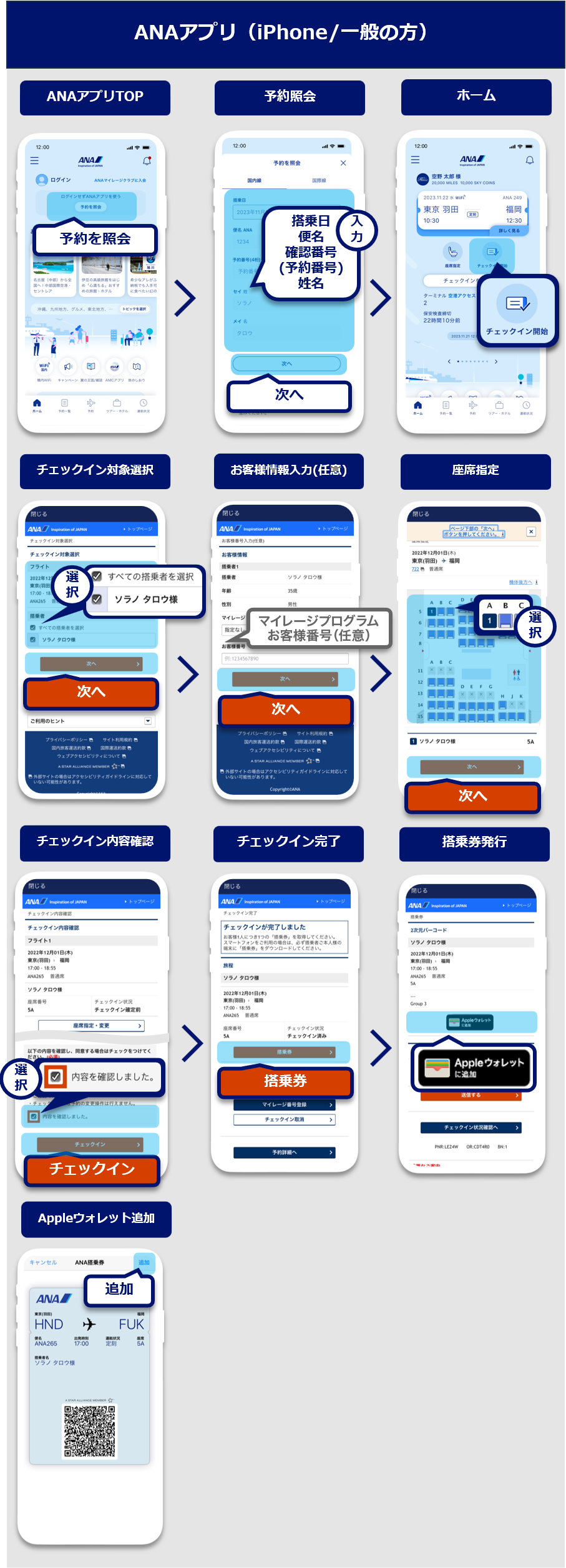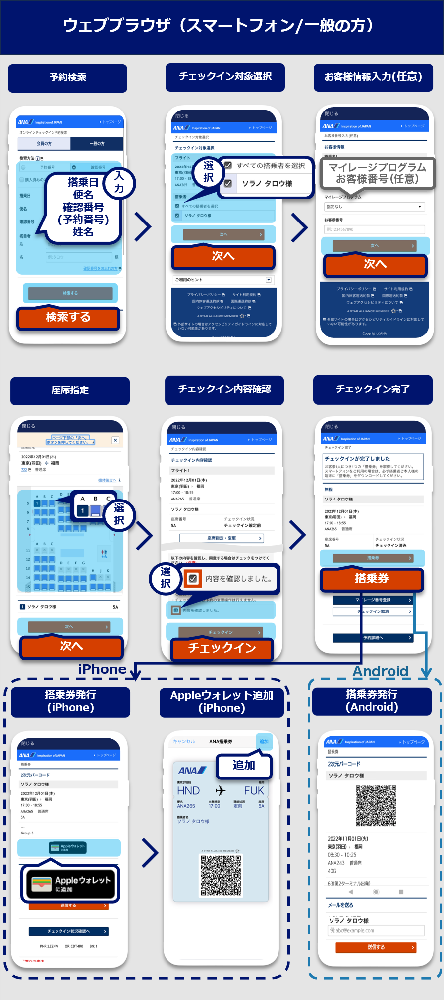 | ANAアプリでのオンラインチェックイン | ウェブブラウザでのオンラインチェックイン(スマートフォン) | ウェブブラウザでのオンラインチェックイン(PC・タブレット) | |