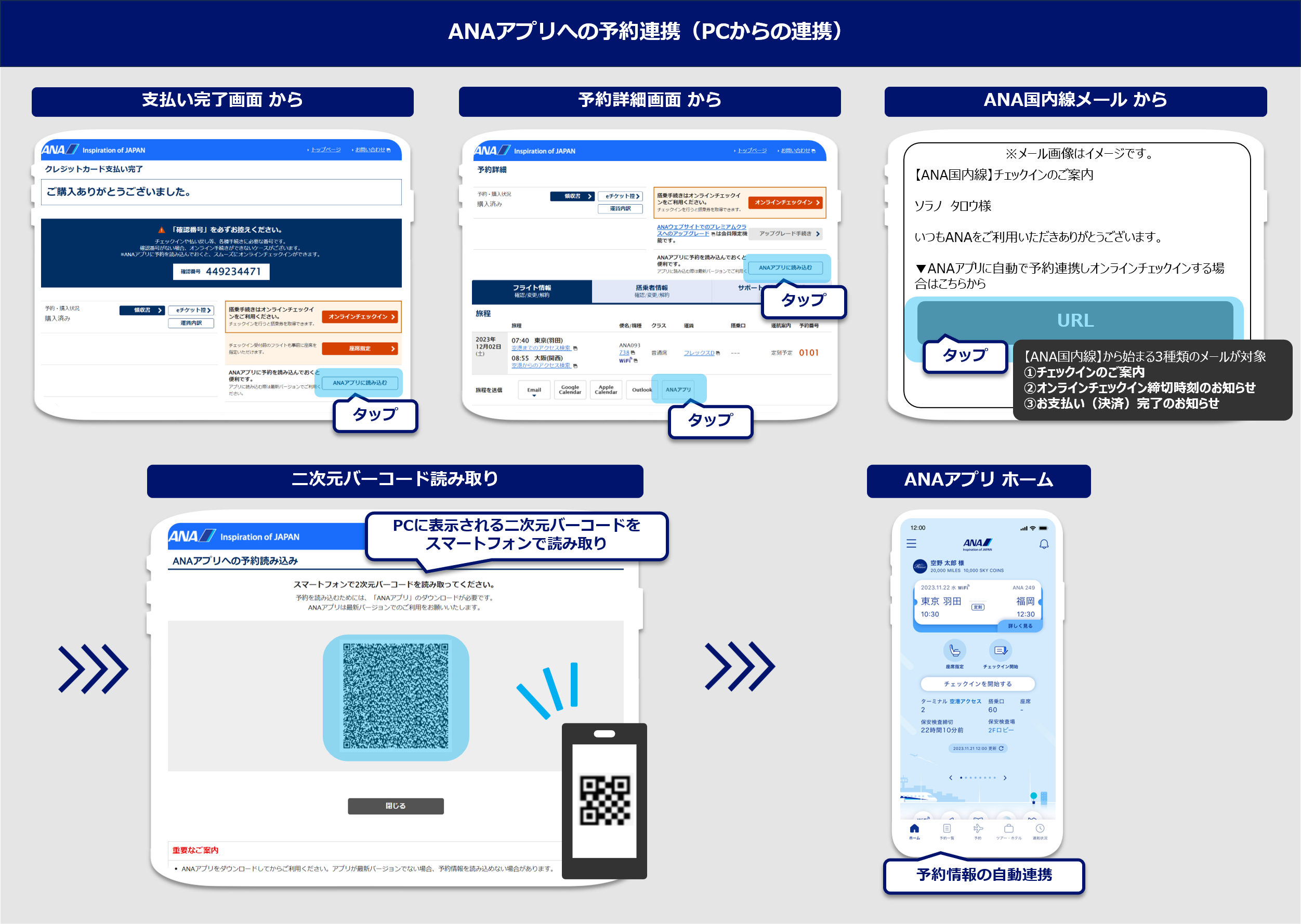 支払い完了画面からANAアプリへ予約連携する場合、支払い完了画面の「ANAアプリに読み込む」を選択。PCに表示される二次元バーコードをスマートフォンで読み取ると連携完了。予約詳細画面からANAアプリへ予約連携する場合、予約詳細画面の「ANAアプリに読み込む」、または「ANAアプリ」を選択。PCに表示される2次元バーコードをスマートフォンで読み取ると連携完了。ANA国内線メール内からANAアプリへ予約連携する場合、ANA国内線メール内のURLを選択。PCに表示される2次元バーコードをスマートフォンで読み取ると連携完了。ANAアプリへ連携できるANA国内線メールは「チェックインのご案内」、「オンラインチェックイン締切時刻のお知らせ」、「支払い完了のお知らせ」の3種類のメールが対象になります。