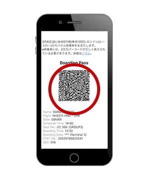 2次元バーコードと便情報・お客様情報が表示された画面をご提示ください。2次元バーコードのみの場合、通過できないことがあります。