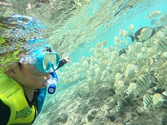 水面をのぞけば、色鮮やかな魚たちが。お子様も大人も夢中になる、ハワイならではの海遊びです。道具は現地でも借りられるので、気軽に楽しめます。