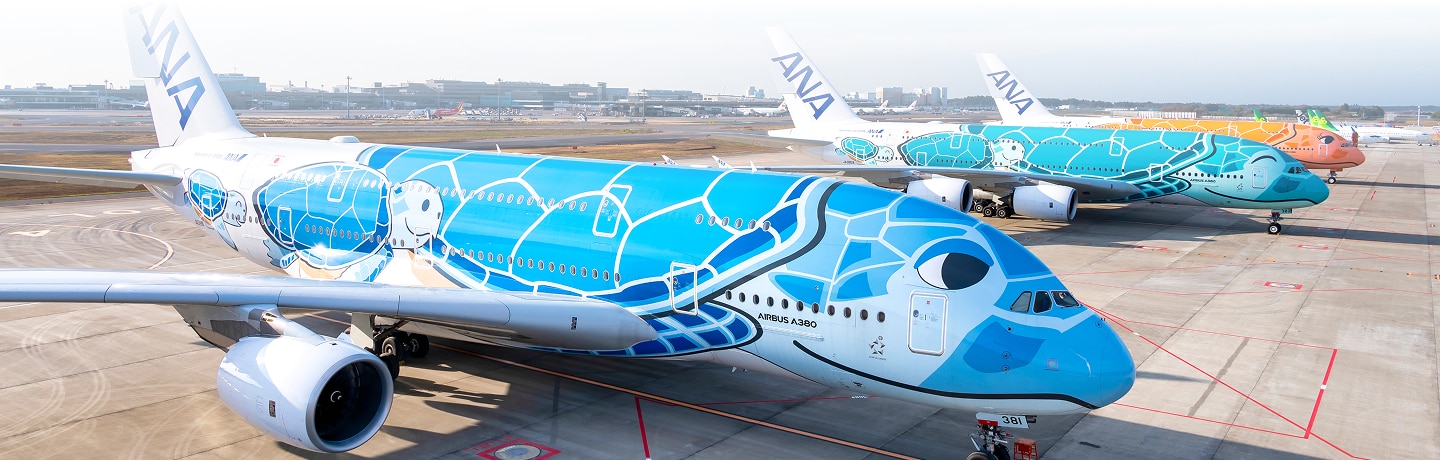 ゲートであなたを待つのは、ウミガメのデザインがされた飛行機エアバスA380型機「FLYING HONU」。